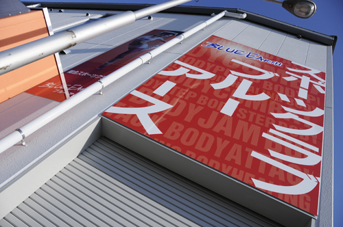 面積が一番大きい壁面看板B。文字だけという希望でしたので、文字のみのデザイン。遠くから認知できるように面積いっぱいに広がる骨太のブルーアースの文字。背景にスタジオプログラムを入れてジムらしい活気を演出。文字を意図的に斜めに配置するなど、これまたジムらしいアクティブな動きを演出してみました。