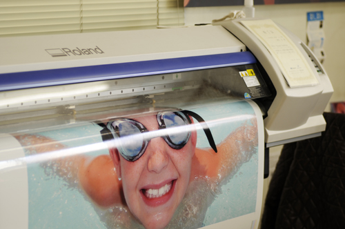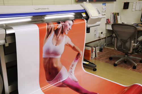 長方形の形である壁面看板A。スペースが決まっているので、大きさを考慮しながらスポーツクラブであることが一目でわかるビジュアル、特に「ブルーアース」様のイメージに合うような写真を選出することから作業が始まりました。